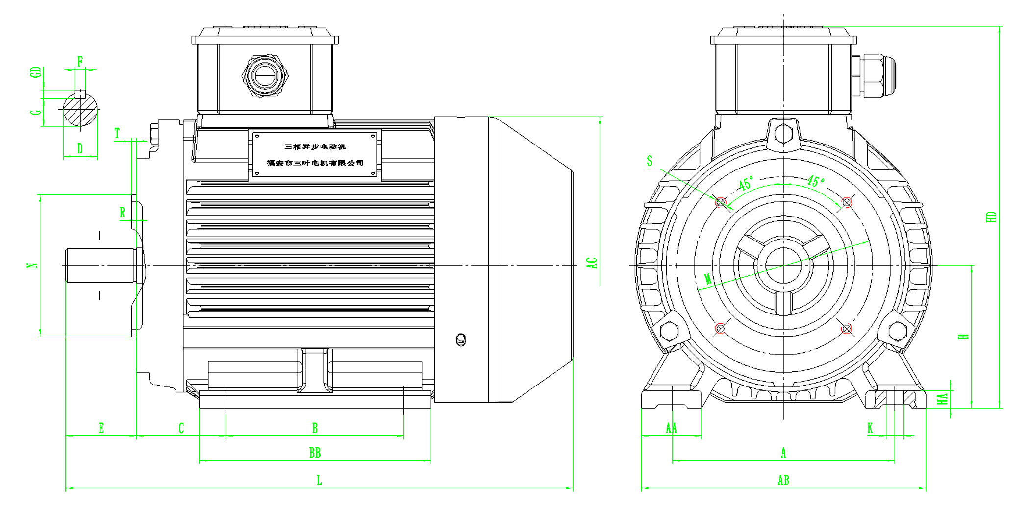 | YE2-315L | 4、6 | 315 | 508 | 508 | 216 | 80 | 170 | 22 | 71 | 14 | 28 | 1368 | 120 | 45 | 628 | 680 | 627 | 845 |